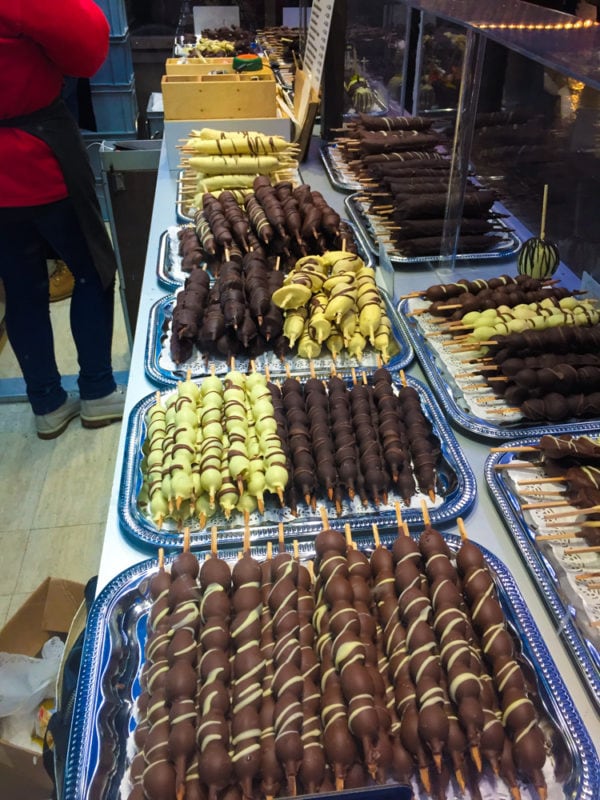 Satisfying your sweet tooth is easy with stall after stall filled with Lebkuchen (gingerbread), Stollen (German Christmas bread with powdered sugar on top), Gebrannte Mandeln (hot cinnamon almonds), crepes, holiday candy, chocolates, cookies, cakes, doughnuts, and so much more.